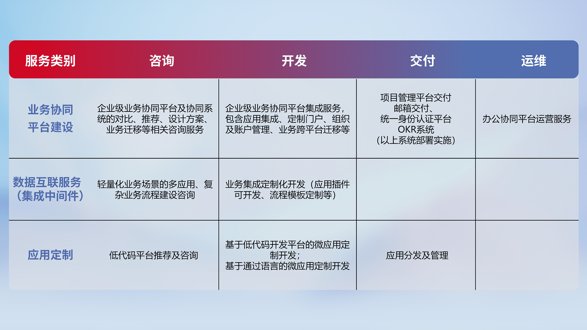 针对钉钉、、企微、、、IDaas等平台级产品提供产品的规划、、、、方案、、、、交付、、、、定制化开发等服务,,,,实现如统一协同办公、、智能客户服务、、混合会议管理、、智能数据查询、、、等业务场景,,实现数字化转型。。